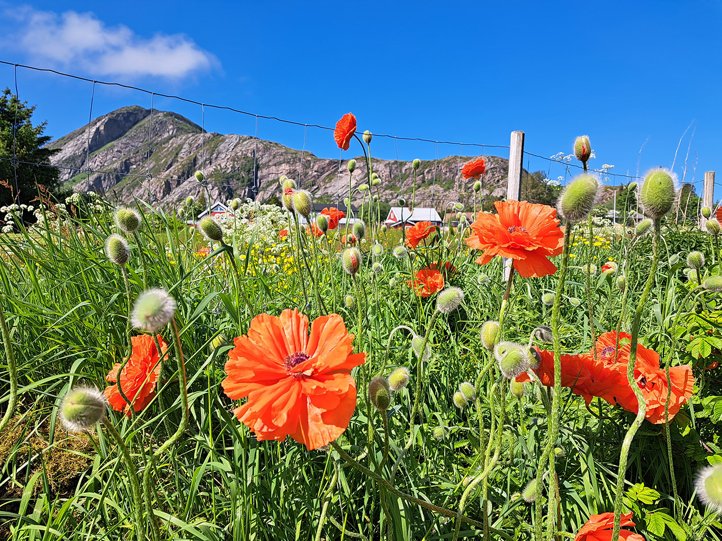 Vår på øya, valmuen trivast godt på øya, her med det særeigne Bolgfjellet i bakgrunnen.